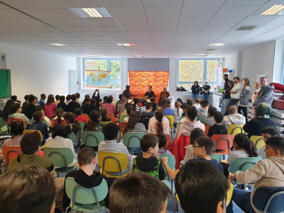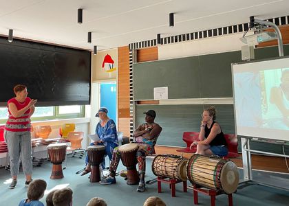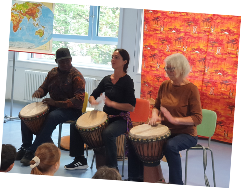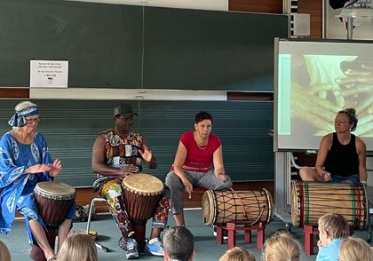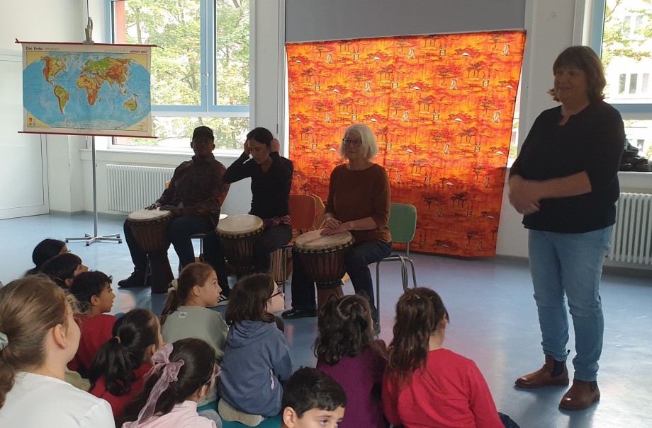 Die Schüler*innen waren begeistert von den afrikanischen Rhythmen und brachen nach jeder Darbietung in lautstarken Jubel aus. Das hat allen Beteiligten einen großen Spaß bereitet! Ganz Ohr, aber auch ganz lebendig dabei, waren die Schüler*innen als sie von Anja Konaté erfuhren, wie sich das Leben bzw. das Schulleben mancher Kinder in Afrika gestaltet, welche Unterstützung notwendig ist und wofür die Spendengelder in Guinea verwendet werden.