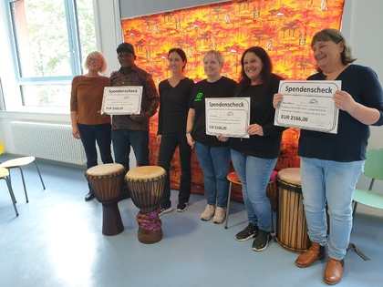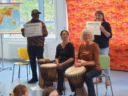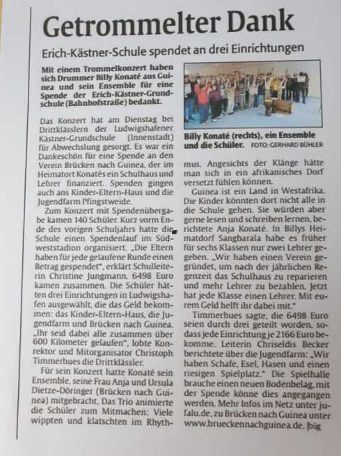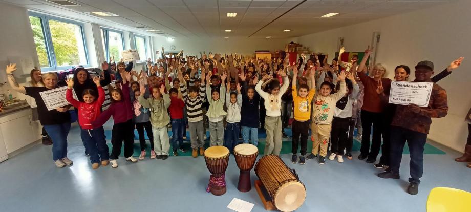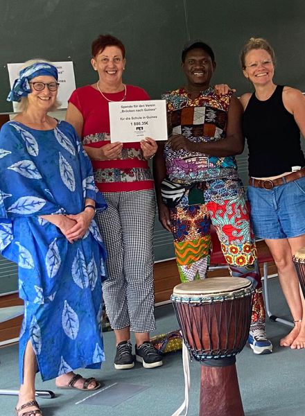 Die Schule hatte im Vorfeld einen Spendenlauf veranstaltet, bei dem die 630 Schüler aus 29 Klassen einen nicht unerheblichen, vierstelligen Betrag erlaufen haben. Da man dieses Mal u. A. Menschen in einem anderen Land unterstützen wollte, fiel die Wahl, außer auf zwei lokale Einrichtungen, auch auf den Verein „Brücken nach Guinea“ und somit auf ein Schulprojekt in Guinea. Bei der offiziellen Spendenübergabe bedankten sich Billy Konaté, weltberühmter Meistertrommler, und sein Ensemble mit einer mitreißenden Trommelsession.