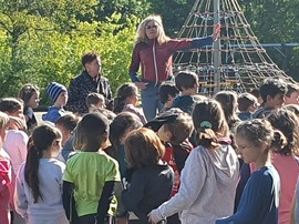 im roten T-Shirt an der Sangban die Schulleiterin der Grundschule Billigheim-Ingenheim, Frau Christine Gein -