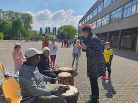 Billy Konaté hat auf Einladung von Frau Christine Gein, Schulleiterin der Grundschule Billigheim-Ingenheim, im Rahmen eines Musikprojektes der Schule mit den begeisterten Schülerinnen und Schülern sowie Frau Julia Hüther, Lehrkraft an der Klingbachschule und Betreuerin der Trommel- und Musikkurse, fleißig getrommelt und auf eine Aufführung hingearbeitet.